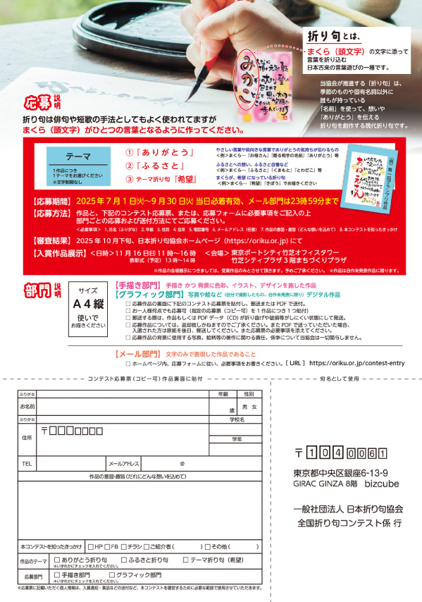 一般社団法人 日本折り句協会 全国折り句コンテスト係 行 PDFデータの場合は、下記フォームよりご応募ください。 作品応募フォーム